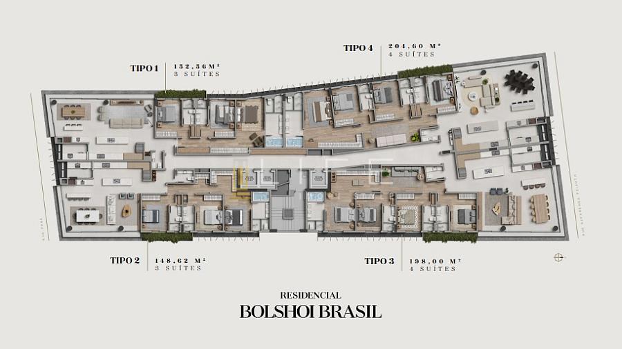 Esta planta conta com amplos 204,60m² privativos, com um living integrado com sala de estar, sala de jantar e cozinha americana, área gourmet com churrasqueira,lavabo e área de serviço.