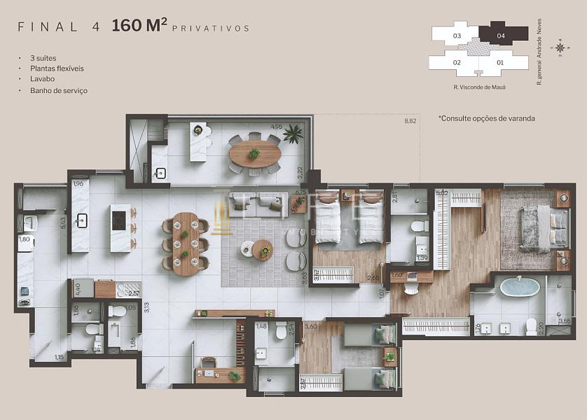 Plantas com 160m² privativos, 3 suítes sendo a principal master, ampla varanda gourmet com churrasqueira e uma vista espetacular, integrada à um living com estar, jantar e cozinha. Conta também com lavabo, espaço home office e área de serviço com banheiro de apoio.
