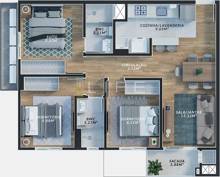 Plantas com 64,32m² privativos, com living integrado à sacada com churrasqueira a carvão.