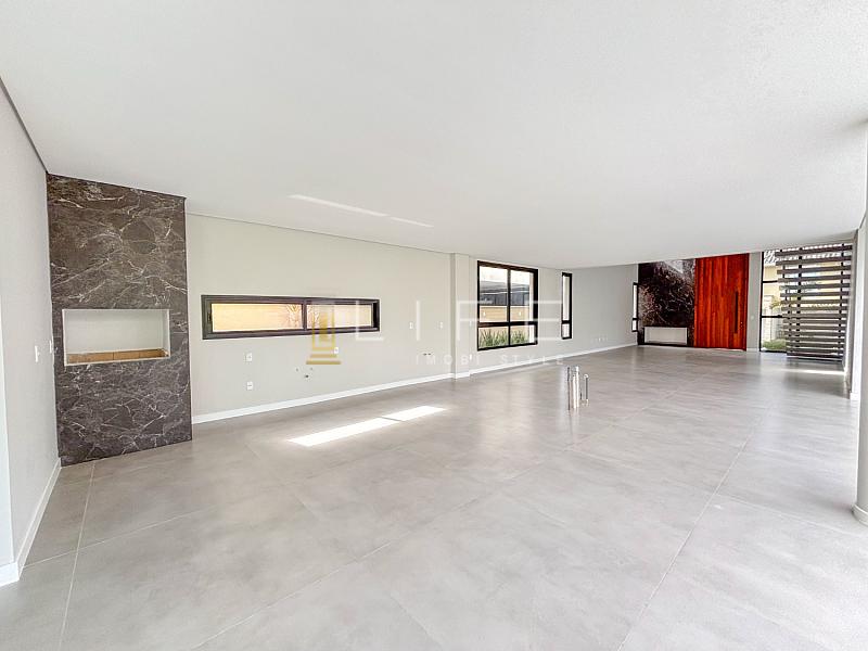 O pé direito duplo na sala e o mezanino conferem um charme incontestável. A porta principal acompanha o pé direito duplo, sendo chão ao teto deixando a casa ainda mais sofiscada.