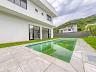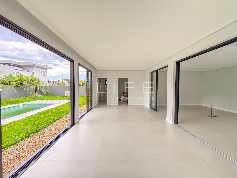 O design é contemporâneo, com uma combinação elegante de vidro, madeira e alvenaria que traz personalidade e sofisticação à casa. As grandes janelas deixam a luz natural invadir todos os ambientes, criando uma sensação de leveza e conexão com o exterior.