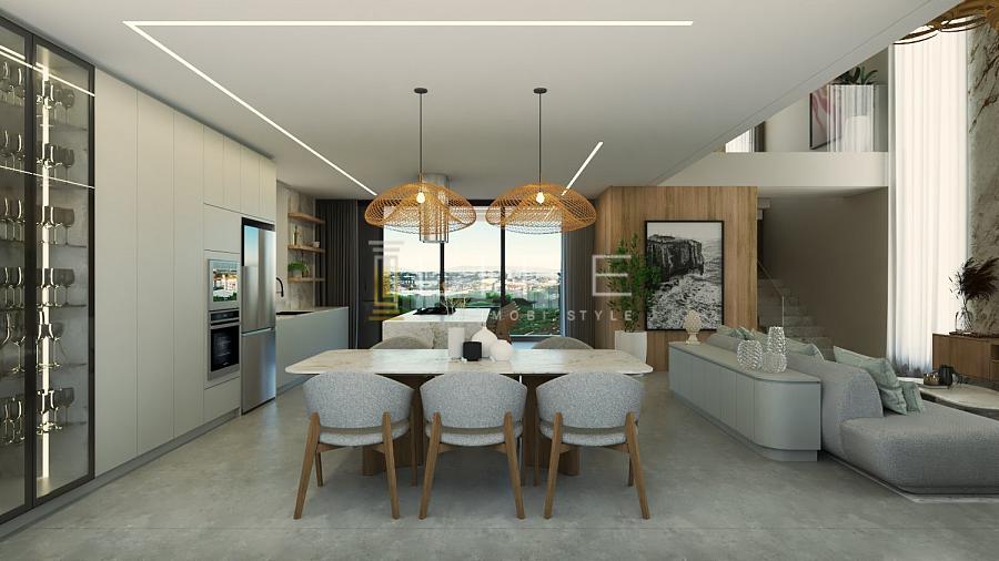 Living integrado, mezanino, área de churrasqueira.