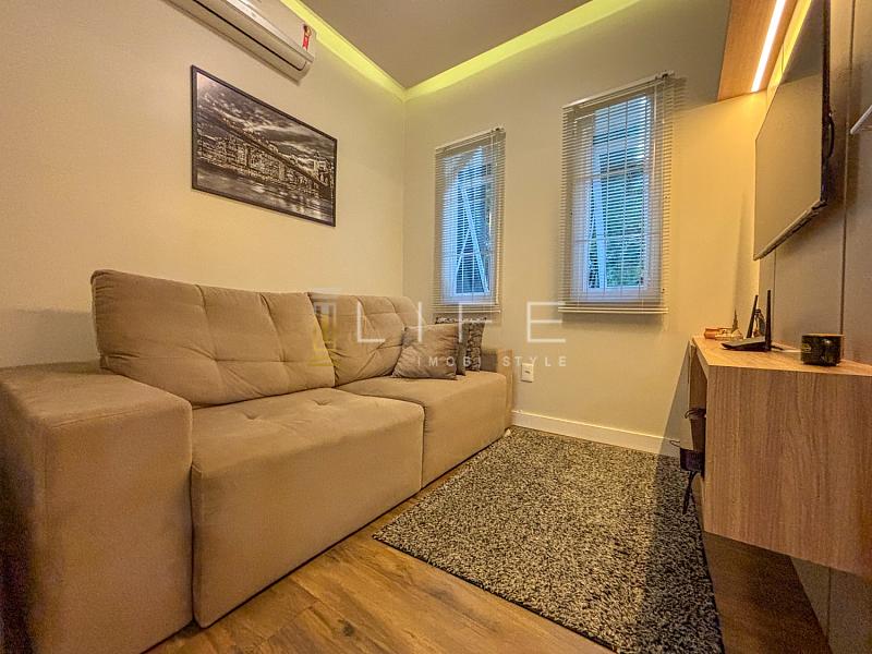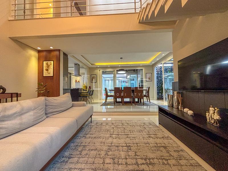 Ambientes integrados, sala de TV e estar com pé direto duplo. Sala íntima de TV/Game.